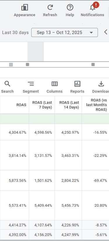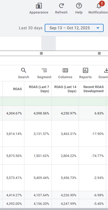 Recent ROAS DevelopmentComparison of your recent ROAS performance and your manually selected timeframe-ROASПорівнює ROAS за 7 днів з ROAS за обраний період.(Conversion_value_by_conv_time.date_range(last_7_days) / Cost.date_range(last_7_days) - (Conversion_value_by_conv_time/ Cost)) / (Conversion_value_by_conv_time/ Cost)All (Campaign, ad group, keyword)Percentage (%)General