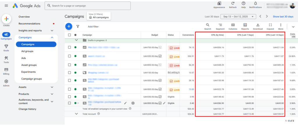 • Високий позитивний %: Означає, що CPA зросла (тобто, конверсії стали дорожчими). Це сигнал для негайного аналізу причин і оптимізації кампаній, щоб знизити витрати на залучення.