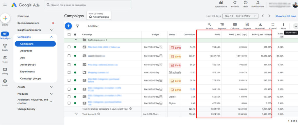 • Більш обґрунтовані рішення щодо ставок та бюджету: Якщо ви бачите, що кампанія перевищує або не досягає прогнозованої цінності, ви можете відповідно змінити ставки (tROAS змінити) або бюджет.