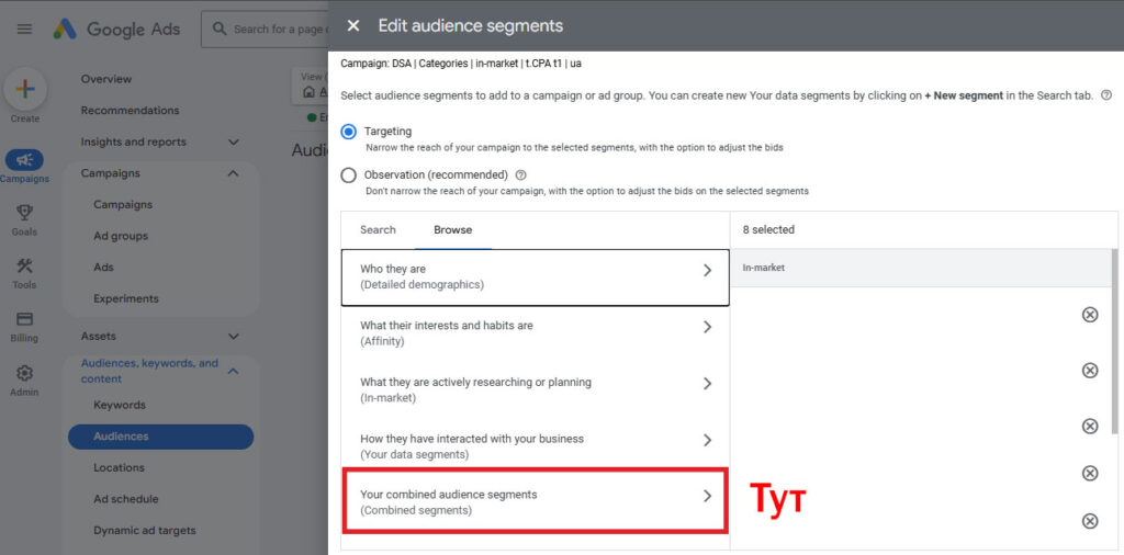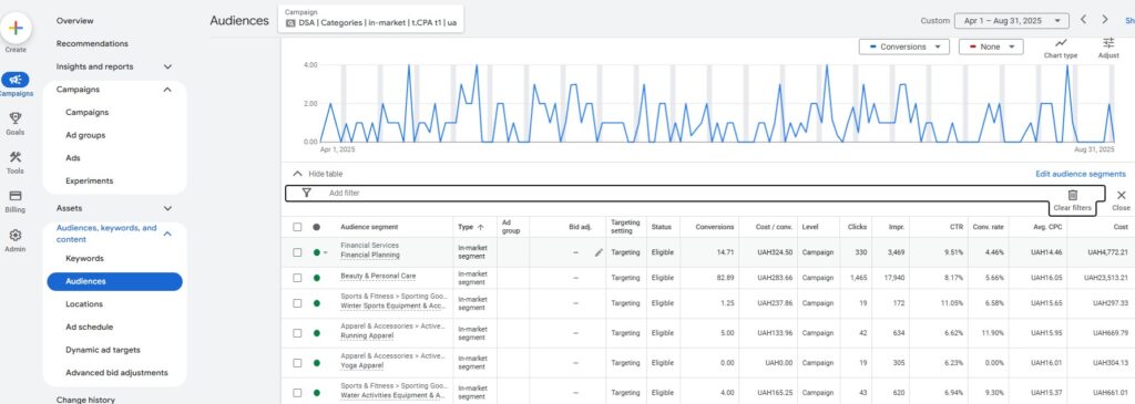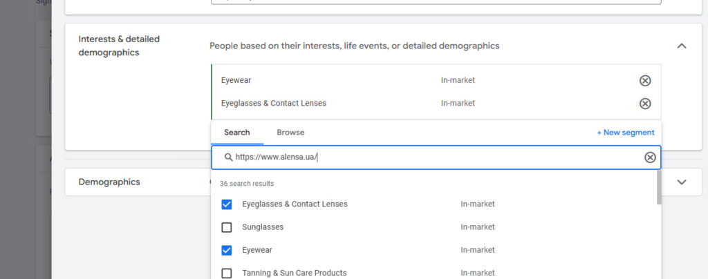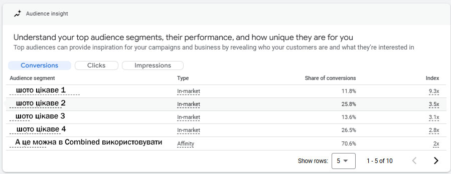 Зазвичай найкраще відпрацьовує in-market аудиторія. Це може бути переглянути в PMAx і будь якій кампанії. Але чим вужче і тематичніше товари в вашій кампанії – тим точніше будуть цільові аудиторії. - Брендові пошукові – додайте в аудиторії affinity та in-market.