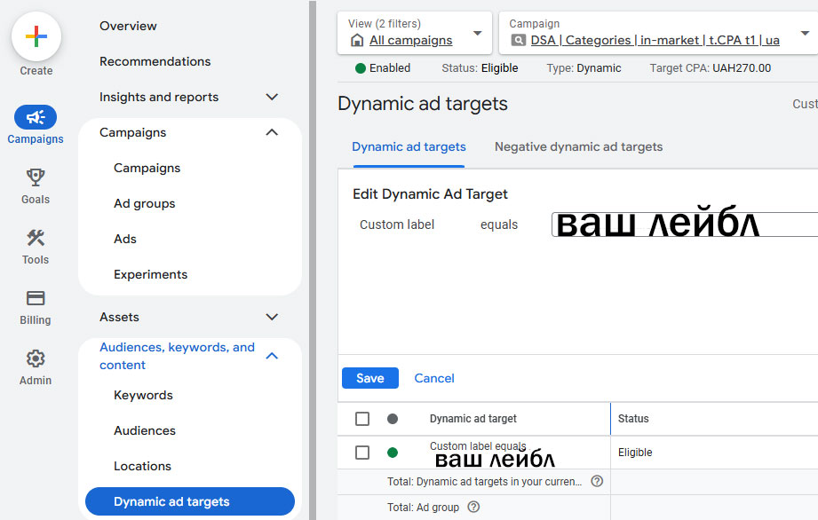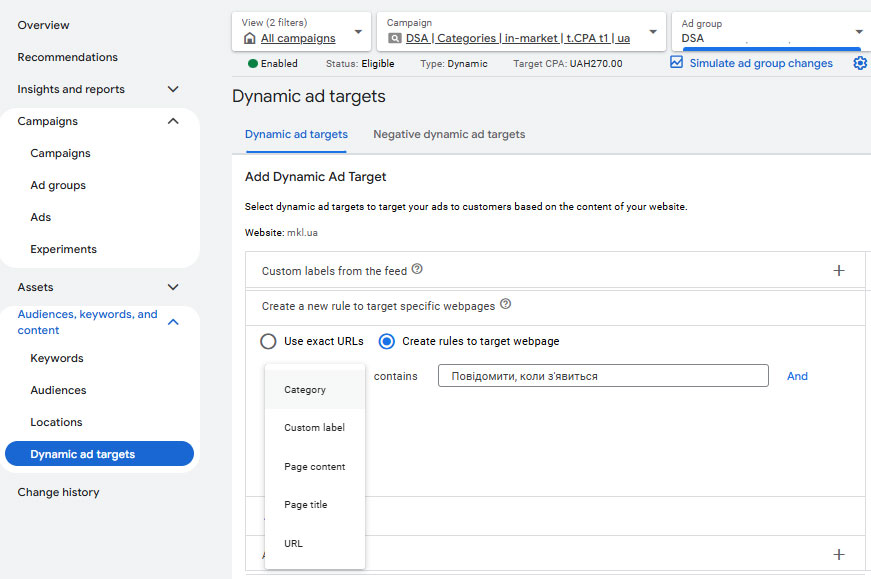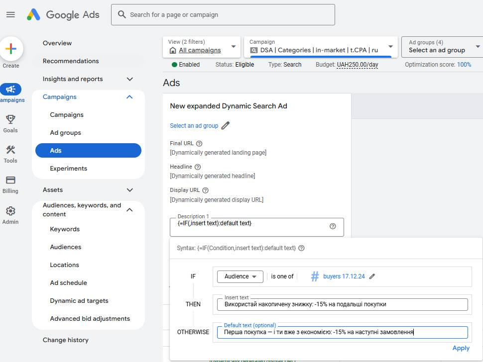 Створюєте Динамічні пошукові оголошення – додаєте ваші “конверсійні” аудиторії. Вуаля! Кампанія з цільовими запитами на цільові аудиторії.