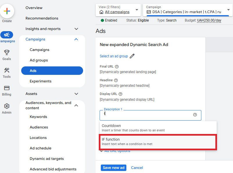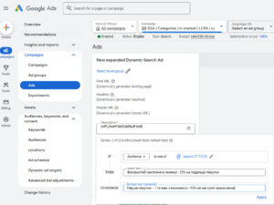 Після створення – заходите на рівень груп оголошень і створюєте оголошення – обравши динамічні пошукові.