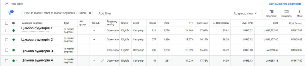 Через деякий час дізнаєтесь яка аудиторія відпрацьовує найкраще. (А брендові, тому що розраховую що там трафіку багато і % конверсій високий.) - Те саме стосується пошукових та продуктових кампаній за попитом – додайте туди для спостереження аудиторії.