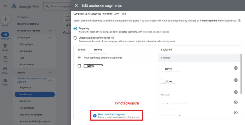 1. Створити комбіновану аудиторію