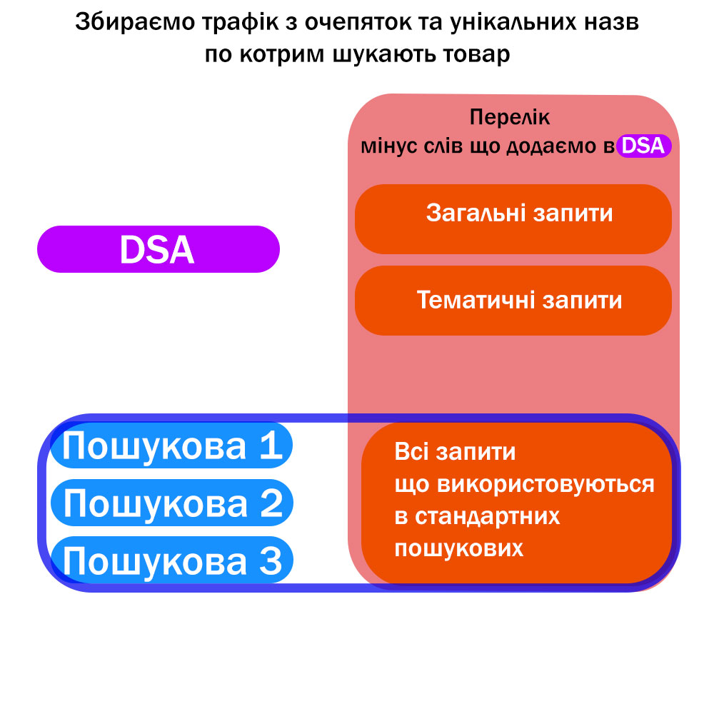 • запити, що вже опрацьовуються іншими кампаніями (щоб динамічні пошукові не конкурували в аукціоні),